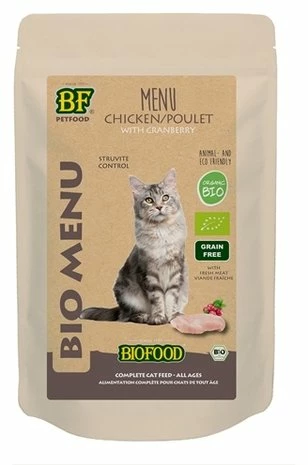 BF Petfood Organic Kat Kip Menu Pouch 20 x 100 gram kattenvoer is biologisch, graanvrij natvoer voor de kat, uit 100% biologisch vlees en biologische groente, een complete maaltijd.