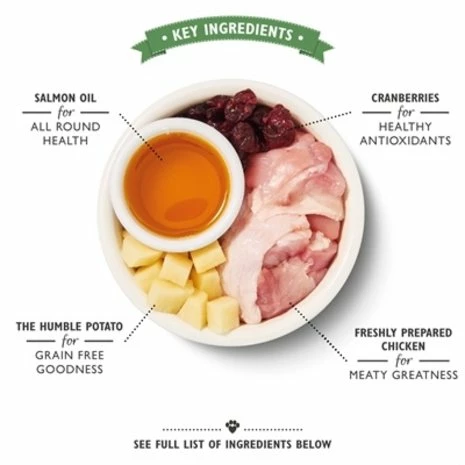 Aardappel (22%), Ei, Kipjus, Lijnzaad, Prebiotica (Fructooligosacchariden 0,7 g / kg) Cellulose, Italiaanse kaas, Zeewier, Wortelen (0,02%), Veenbessen. Bosbessen, peterselie (0,02%), fenegriekzaden