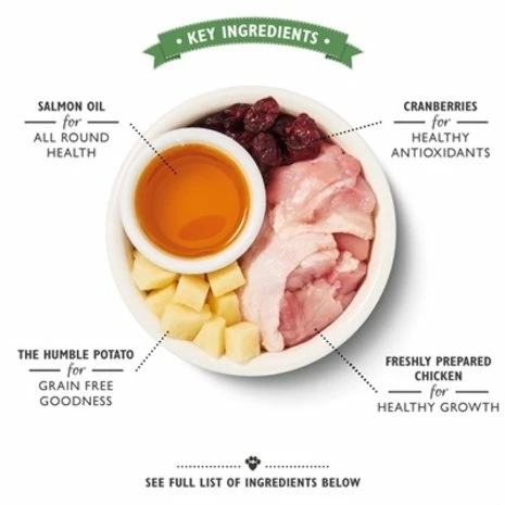 Samenstelling: 75% kip en vis: Verse kip (50%), Kippenlever (15%), vers bereide seizoensgebonden witte vis (10%). Aardappel, Ei, Kippenbouillon, Lijnzaad, Zalmolie, Prebiotica (Mannan-oligosacchariden 1,1 g / kg, Fructooligosacchariden 0,7 g / kg), Italiaanse kaas, Zeewier, Wortelen, Amerikaanse veenbessen, Bosbessen, Peterselie, Fenegriekzaden