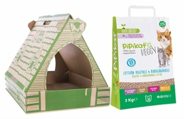 De Pipikat Veggy Kit Kattenbak Met Vulling van 3 kg is een set van een kartonnen toilethuisje met een zak plantaardige, biologisch afbreekbare klontvormende kattenbakvulling. Een leuke set die ook nog eens zeer milieubewust is! De Pipikat Veggy kattenbakvulling is geheel gemaakt van plantaardige vezels en ingrediënten. Het grote voordeel hiervan is niet alleen dat de vulling hierdoor geen stof produceert, maar ook dat deze 100% biologisch afbreekbaar is. Pipikat is klontvormend en zeer absorberend: de vulling kan worden weggegooid als organisch afval en kleine klontjes kunnen zelfs door het toilet gespoeld worden! Bovendien is Pipikat zacht aan de pootjes en voorkomt geurtjes door de antibacteriële eigenschappen.