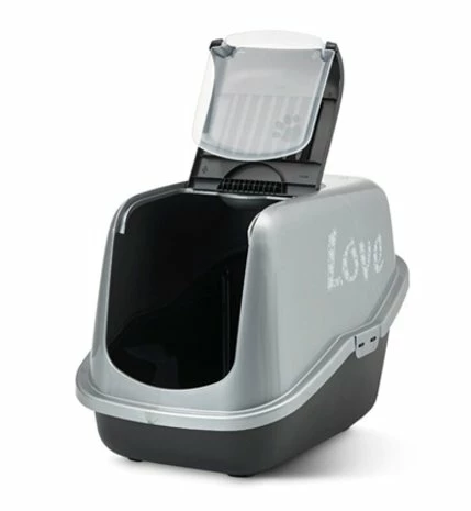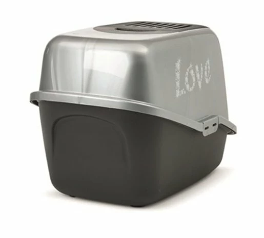 De Savic Kattenbak Nestor Impression Zwart / Zilver van 56 x 39 x 38,5 cm is een modern kattentoilet met topopening voor een snelle reiniging. Deze kattenbak is door het handige design erg makkelijk schoon te maken. De voorkant gaat extra ver open, waardoor uitscheppen gemakkelijk gedaan kan worden zonder de hele kap te hoeven verwijderen. De onderbak heeft een extra hoge achterzijde waardoor lekkage voorkomen wordt. Daarnaast is de kattenbak uitgerust met handgreep, kunststof draaideur en verwisselbare koolfilter om nare luchtjes rondom de kattenbak te voorkomen. De kattenbak is uitgerust met de opdruk ‘love’ aan de zijkant.