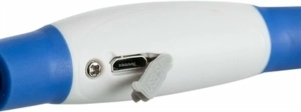 De Trixie Halsband USB Flash Light Lichtgevend Oplaadbaar Blauw S-M 40 x 0,8 cm is een lichtgevende halsband voor de hond, met knipper of constant-functie, spatwaterbestendig en gemakkelijk op maat te maken. Jij hoeft niet meer bang te zijn dat jouw hond ’s avonds of tijdens grauwe dagen niet meer goed zichtbaar is met deze halsband van Trixie. Deze halsband is gemaakt van kunststof/TPU, waardoor hij gemakkelijk op maat te knippen is. De halsband is rondom verlicht en je kunt kiezen tussen knipperlicht (14 branduren) en continue-licht (6 branduren). Na gebruik kun je de halsband opladen met de meegeleverde USB-kabel. De halsband is spatwaterbestendig en dus ook geschikt voor regenachtige dagen. Met een zichtbaarheid tot wel 200 meter!