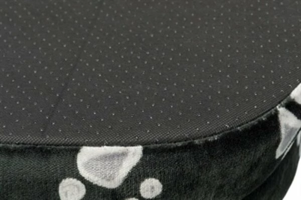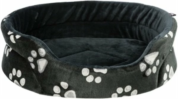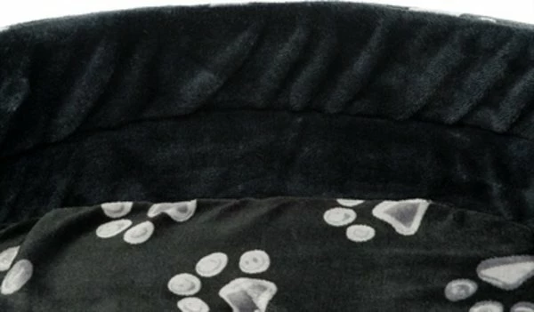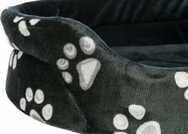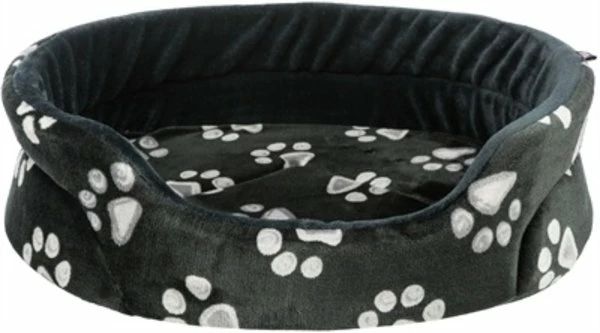 De Trixie Mand Jimmy Ovaal Zwart Met Pootprint 44 x 35 cm is een zachte hondenmand met opstaande rand en lage instap, met schuimrubber vulling, wendbaar kussen en slipvaste onderkant. Deze mand biedt jouw hond een fijne plek om in weg te kruipen. Mand Jimmy heeft een opstaande rand met schuimrubber vulling, bekleed met zacht pluche voor meer comfort en een veilig gevoel. De lage instap zorgt ervoor dat ook honden die kleiner zijn of slecht ter been zijn gemakkelijk de mand in kunnen stappen. De mand is voorzien van een wendbaar kussen en een slipvaste onderkant. Hierdoor wordt voorkomen dat de mand verschuift bij het in- en uitstappen.