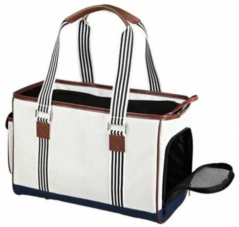 Trixie Hondentas Elisa Wit/Blauw 20X26X41 cm is een stijlvolle hondentas. De hondentas is gemaakt van stevig polyester en is voorzien van voldoende ventilatie. Deze hondentas kan je van boven en aan de voorkant openmaken. Dankzij de geïntegreerde korthouder kan je jouw hond vastbinden om uitspringen te voorkomen. Deze hondentas heeft buitenvakken, zodat je jouw spullen kan opbergen. De gevoerde draagriemen maken het dragen aangenamer. Het canvas is afgezet met kunstleer (polyester), waardoor het een stijlvolle canvas look krijgt.