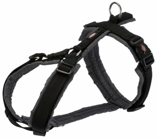 Het Trixie Hondentuig Premium Trekking Zwart / Grijs 70 -85 x 2,5 cm is een comfortabel hondenharnas voor de hond, met zachte voering en extra aanleiding op de buik. Een zeer comfortabel tuig dat speciaal gemaakt is voor baasjes die graag lange afstanden met de hond afleggen, en natuurlijk voor iedereen die gewoon graag wat meer comfort heeft! Dit tuig is gemaakt van stevig singelband met een zachte voering rondom, zodat schuur- en drukplekken ten alle tijden voorkomen worden. Het tuig is bovendien traploos verstelbaar bij de nek en de buik voor een optimale pasvorm. De extra aanlijn-ring op de buik en extra oogjes om bijvoorbeeld een penning of flasher aan te hangen maken het tuig zeer functioneel voor diverse doeleinden.