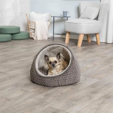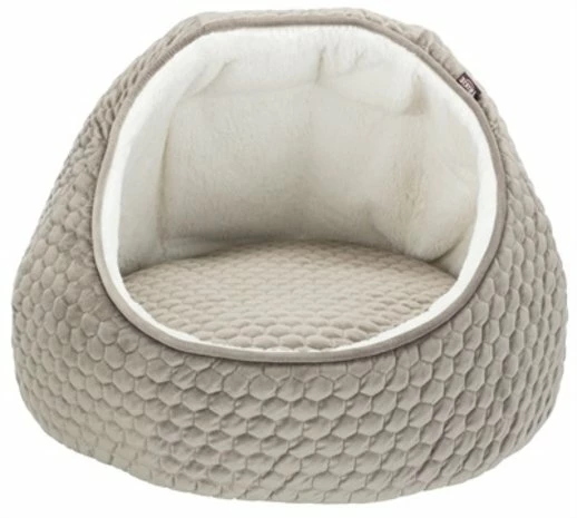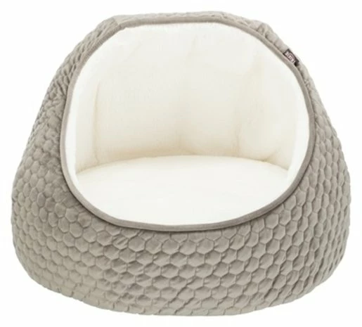 De Trixie Kattenmand Iglo Livia Grijs / Creme 55 x 55 x 45 cm is een knusse kattenmand in velourslook met pluche binnenkant en wendbaar kussen. In deze mand voelt jouw kat zich heerlijk veilig! Door de ronde vorm is jouw kat aan bijna alle kanten beschermd en kan hij comfortabel tegen de hoge randen aanliggen. De buitenkant van het mandje is uitgevoerd in een leuke velours look en het kattenbed heeft een binnenkant met doorgestikte pluche bekleding. Door de polyestervlies en schuimrubber vulling ligt jouw kat stevig en de slipvaste onderkant zorgt dat jouw dier gemakkelijk in en uit de mand kan stappen. Het leuke kussen is bovendien wendbaar en heeft twee verschillende designs, zodat jij zelf de uitstraling van het mandje kan kiezen!