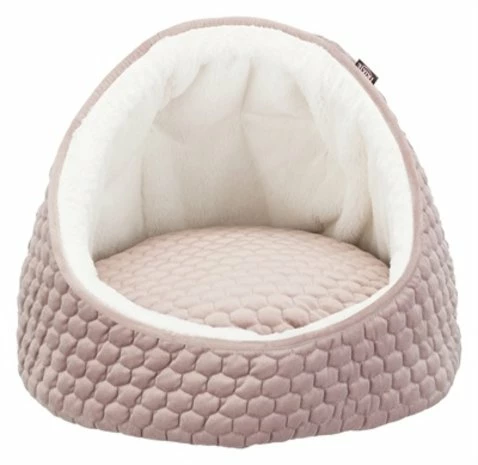 De Trixie Kattenmand Iglo Livia Roze / Creme 45 x 45 x 33 cm is een knusse kattenmand in velourslook met pluche binnenkant en wendbaar kussen. In deze mand voelt jouw kat zich heerlijk veilig! Door de ronde vorm is jouw kat aan bijna alle kanten beschermd en kan hij comfortabel tegen de hoge randen aanliggen. De buitenkant van het mandje is uitgevoerd in een leuke velours look en het kattenbed heeft een binnenkant met doorgestikte pluche bekleding. Door de polyestervlies en schuimrubber vulling ligt jouw kat stevig en de slipvaste onderkant zorgt dat jouw dier gemakkelijk in en uit de mand kan stappen. Het leuke kussen is bovendien wendbaar en heeft twee verschillende designs, zodat jij zelf de uitstraling van het mandje kan kiezen!