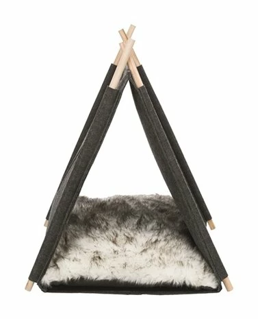 De Trixie Kattenmand Tent Elfie Met Kussen Vilt Antraciet 50 x 46 x 52 cm is een schuilplaats voor de kat, een tipi tent gemaakt van vilt met omkeerbaar kussen. Echt lekker wegdromen doet jouw kat of kleine hond in deze leuke schuiltent van Trixie. Deze tent is gemaakt van vilt met een frame van hout, dat inklapbaar en ruimtebesparend op te bergen is. De tent is voorzien van een omkeerbaar kussen met een overtrek met aan één zijde langharig pluche om lekker in weg te kruipen en aan de andere kant geweven stof, gevuld met comfortabel polyesterfleece. De slipvaste onderkant zorgt er bovendien voor dat de tent niet kan verschuiven bij het in- en uitstappen.