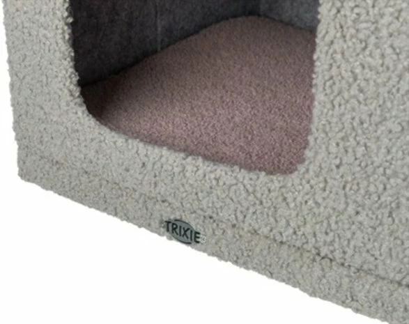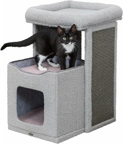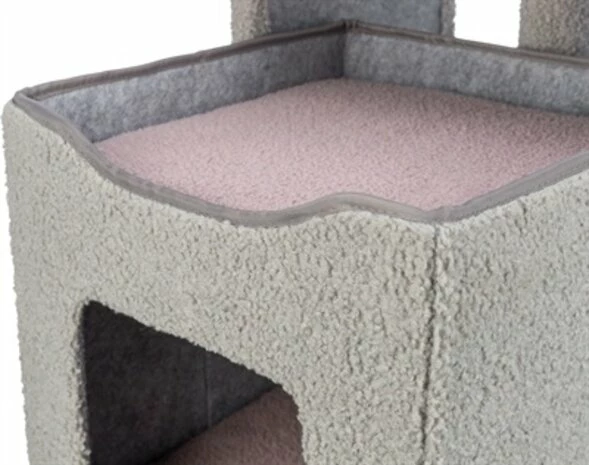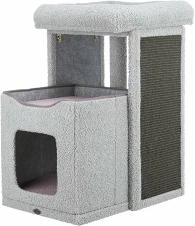 De Trixie Kitten Krabpaal Carlita Grijs/Lila 63 cm is een krabpaal voor kittens in schapenvacht look met schuilplaats en twee ligplekken. Krabben is voor katten een natuurlijke bezigheid: zo houden zij hun nagels bij en markeren zij hun territorium. Om te voorkomen dat jouw kitten zijn nagels leert slijpen aan het meubulair, is het aan te raden veel krabmogelijkheden in huis te hebben. Daarvoor is deze handige krabpaal uitermate geschikt! De paal bestaat uit een schuilplaats, twee ligplateaus en twee panelen met sisal om de nagels aan te scherpen. De schuilplaats is voorzien van een bekleed ligvlak en verwijderbare, omkeerbare ligmat die op de hand gewassen kan worden. Het mandje is voorzien van een comfortabele, gevoerde rand.