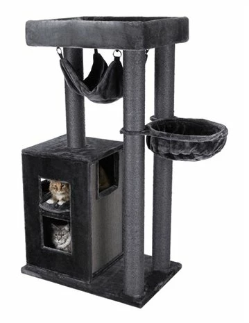 De Trixie Krabpaal Amadeus XXL Grijs van 90 x 60 x 163 is een uitgebreid krabmeubel dat uitermate geschikt voor grote katten. De krabpaal is voorzien van dikke stammen met natuursisal zodat jouw katten naar hartenlust kunnen krabben. Zo blijven jouw stoelen en banken heel! De katten kunnen heerlijk wegdromen in verschillende schuilmogelijkheden: ze hebben keus uit een mandje met gevoerde rand, stevige relax-slaapzak, afneembare hangmat en schuilplaats belkeed met pluche en fleese. De twee verdiepingen bieden jouw kat ruimte om lekker overzicht te houden. De bodemplaat is massief en extra dik, zodat ook grote katten van en op de krabpaal kunnen springen zonder dat deze wiebelt.
