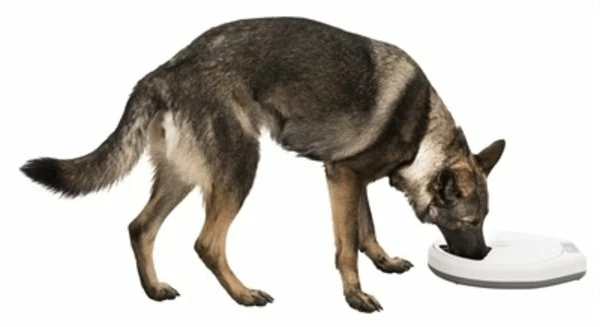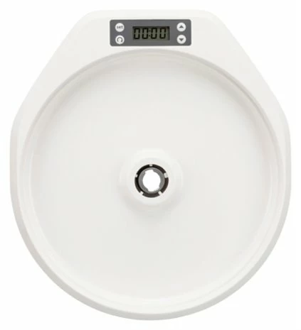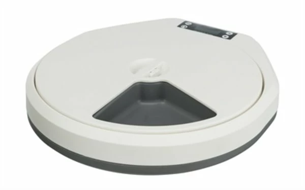 De Trixie TX4+1 Automatische Voerdispenser Wit / Grijs van 36 x 33 x 5 cm is een voerautomaat voor hond en kat, voor 4 + 1 maaltijden à 0,24 liter die ook geschikt is voor natvoer. Deze moderne, ronde voerautomaat is voorzien van een draaimechanisme, waardoor er telkens een ander van de vijf vakken ‘open’ komt te liggen. De opening van de voerautomaat draait over de diverse vakken heen, per ingestelde interval voor vier maaltijden. Per vakje kun je 0,24 liter voer toevoegen, en omdat de schaal van kunststof is, mag dit zowel natvoer als droogvoer zijn. De voerschaal is vaatwasserbestendig voor gemakkelijke reiniging. De TX4+1 werkt op batterijen (4 AA mignon batterijen, niet meegeleverd), dus hoef je niet bang te zijn dat de automaat bij bijvoorbeeld stroomuitval niet meer werkt.