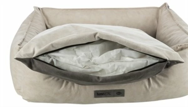 Het Trixie Vital Mand Calito Hoekig Beige / Grijs 80 x 60 cm is een orthopedische hondenmand met visco-elastische en schuimrubber vlokken, wendbaar kussen en een hoes in sjieke velours- en kunstleerlook. Combineer de beste ondersteuning voor jouw hond met stijl met deze mooie, sjieke Calito mand van Trixie! Deze mand biedt jouw hond de perfecte steun tijdens het slapen, door de vulling van visco-elastische en schuimrubber vlokken met memory-effect. Deze laag zorgt voor perfecte drukverdeling tijdens het rusten en het slapen, waardoor de druk op het lichaam beter verdeeld wordt. Dit kan helpen gewrichtsproblemen te voorkomen of te verminderen en zorgt voor een hond die vrolijker en vitaler opstaat. De mand is voorzien van een op 40 graden wasbare hoes van polyester met velours- en kunstleerlook in een kleurcombinatie die zowel bij het moderne, industriële als het landelijke interieur past. Het kussen wendbaar en heerlijk zacht en op de rand met polyestervlies vulling kan de hond comfortabel zijn kop laten rusten. De mand is voorzien van een slipvaste onderkant die schuiven voorkomt wanneer de hond gaat liggen of opstaat.