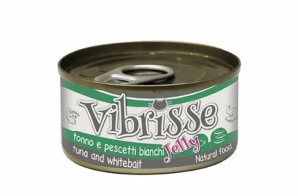 Vibrisse Kat Jelly Tonijn / Witvis 24 x 70 gr is aanvullend natvoer voor de kat in blik, uit malse stukken tonijn en witvis in gelei zonder toevoeging van bewaarmiddelen en kleurstoffen. Een heerlijke traktatie voor jouw kat, die ook bijzonder van pas komt bij katten die weinig drinken. Veel katten hebben de neiging te weinig vocht tot zich te nemen en voor deze dieren is natvoer een perfecte oplossing. Deze smakelijke traktatie van tonijn en witvis in gelei van eigen nat houdt jouw kat gezond en gehydrateerd. Zonder kunstmatige toevoegingen en conserveringsmiddelen!