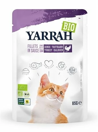 Yarrah Cat Biologische Filets Met Kalkoen In Saus 14X85 gr is een complete, voedzame en zeer smakelijke maaltijd voor de volwassen kat met biologische kip. Gezond, voedzaam en heel erg lekker: dat zijn de biologische filets in saus van Yarrah! Dit zuiver biologische voer is samengesteld zonder chemische toevoegingen, pesticiden en GMO en bestaat uit de best opneembare eiwitten, zodat jouw kat precies binnenkrijgt wat hij nodig heeft. De biologische dieren verwerkt in het voer hebben een beter leven gehad, waarbij ze vrij buiten hebben mogen lopen, puur biologisch hebben gegeten en langer hebben mogen leven. Voor voldoende vezels en een lage bloedsuikerspiegel is er biologisch erwtenzetmeel aan het natvoer toegevoegd. Naast heel erg lekker en voedzaam bevat dit natvoer ook nog eens veel vocht en helpt het jouw kat gehydrateerd te houden!
